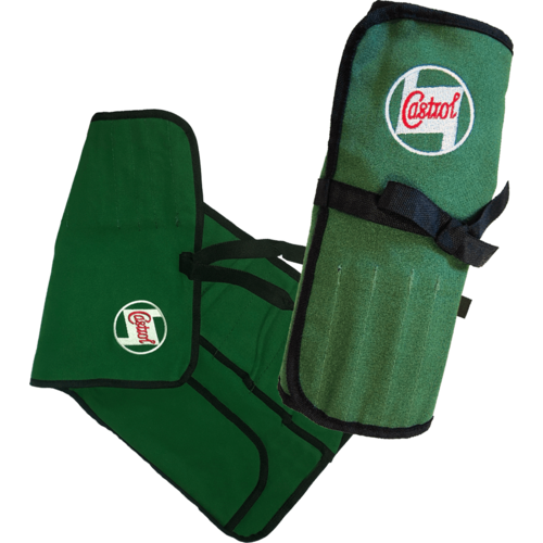 Of course in Castrol green with an embroidered logo. It has 15 pockets. This tool roll is a stylish and practical addition for securly storing emergency tools in your classic vehicle.